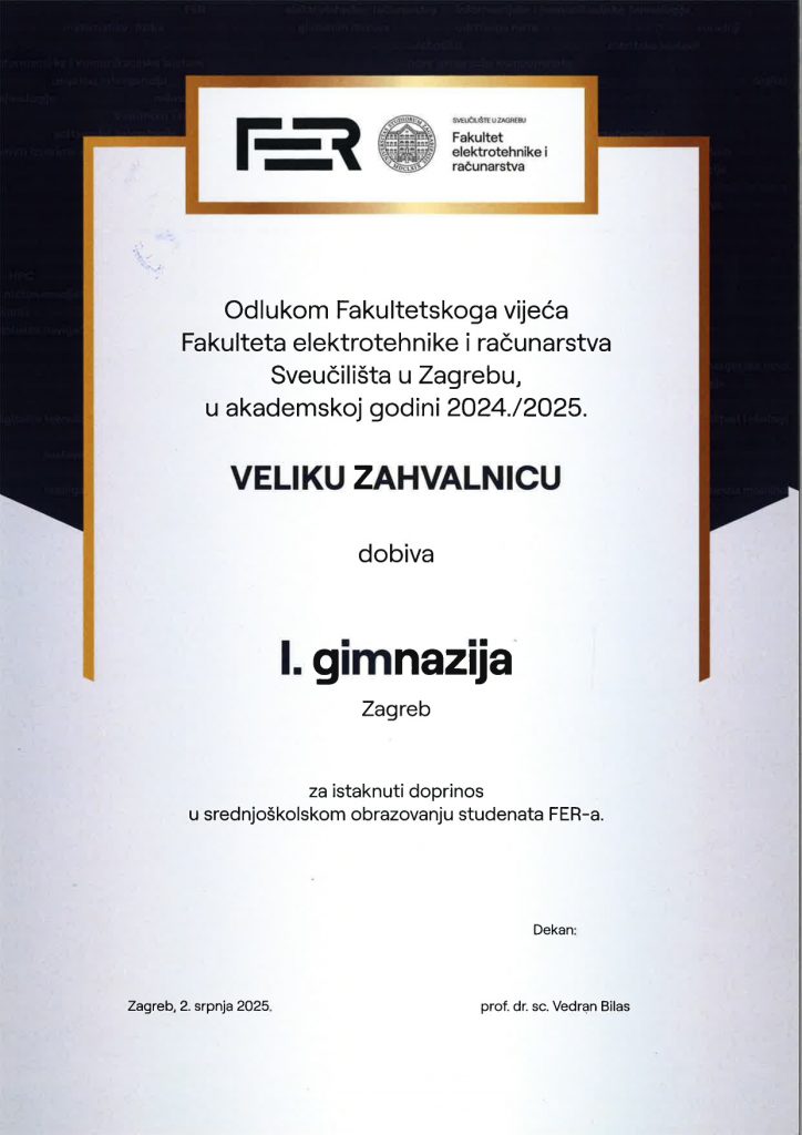 Kao svake godine do sada i ove godine je Fakultet elektrotehnike i računarstva dodjeljivao zahvalnice za istaknuti doprinos u srednjoškolskom obrazovanju njihovih studenata. I ove smo godine među dvadesetak škola u Republici Hrvatskoj, sada već 23. put za redom bez prekida. Zahvalnicu dobivaju one škole čiji su bivši učenici dobri studenti ovog zahtjevnog fakulteta. Ove godine je čak 30 učenika naše škole upisalo FER.