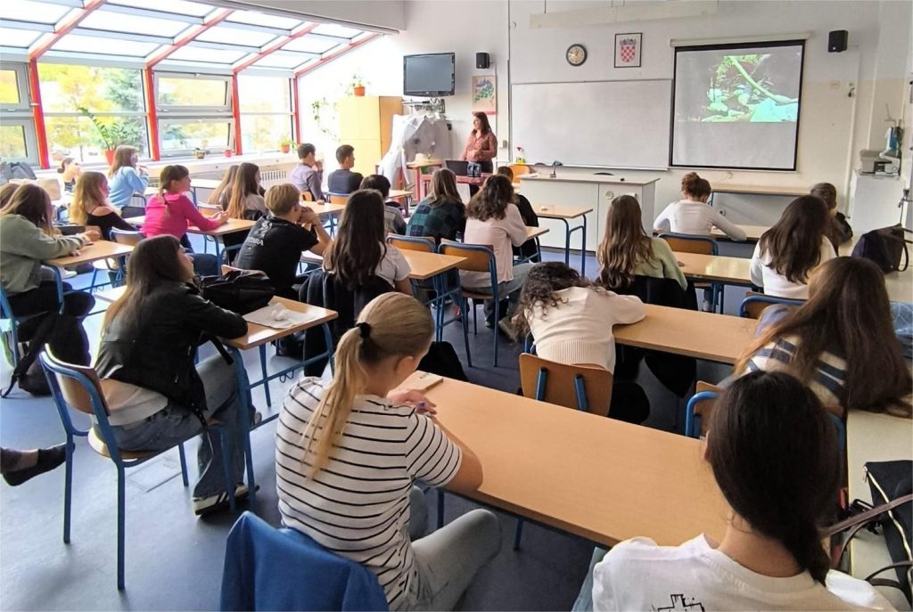 Bivša učenica Prve gimnazije dr. sc. Elena Račevska održala je 23. 10. 2025. predavanje za učenike izborne nastave biologije i psihologije. Dva školska sata učenici su sa zanimanjem pratili profesionalni put prve hrvatske primatologinje od gimnazijskih dana u Prvoj gimnaziji, studija u Oxfordu, doktorata iz područja primatologije do danas kada Elena radi u Zoološkom vrtu u Zagrebu i kao vanjska suradnica na Sveučilištu Algebra Bernays. Interes za životinje pokazivala je odmalena te nakon studija psihologije na Filozofskom fakultetu upisuje izborni kolegij “Ponašanje životinja” na PMF-u kada spoznaje da se tim područjem želi baviti u budućnosti. Nakon volontiranja u zagrebačkom Zoološkom vrtu odlazi na studij u Englesku, a najuzbudljiviji dio njene profesionalne karijere odnosi na istraživački rad s primatima u indonezijskim šumama i na Madagaskaru. Znatiželjni učenici postavljali su tijekom i nakon predavanja mnogobrojna pitanja. Veliko hvala Eleni na dolasku u Prvu gimnaziju.