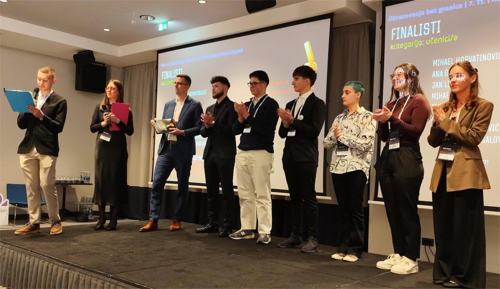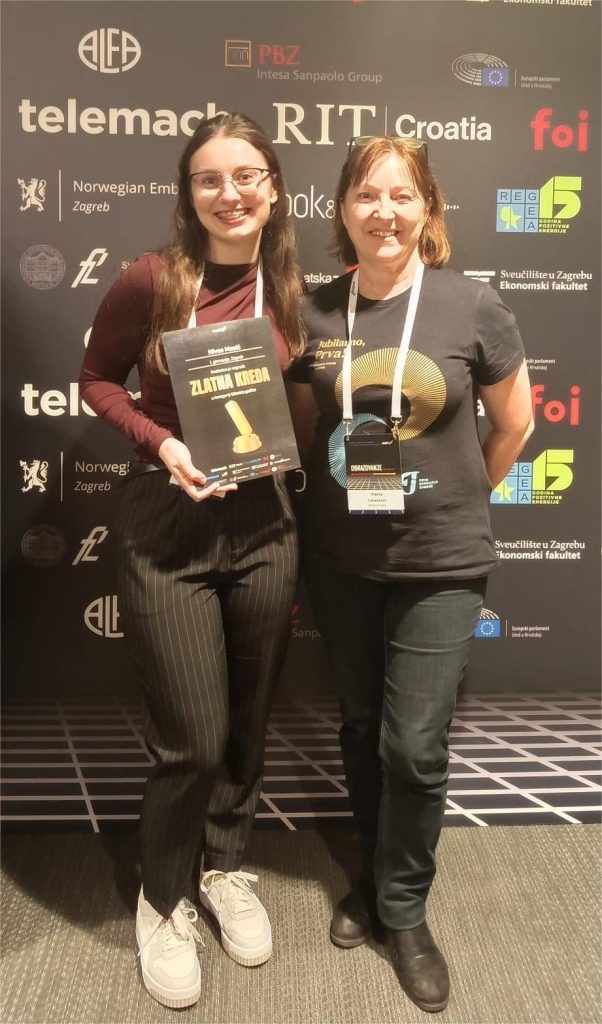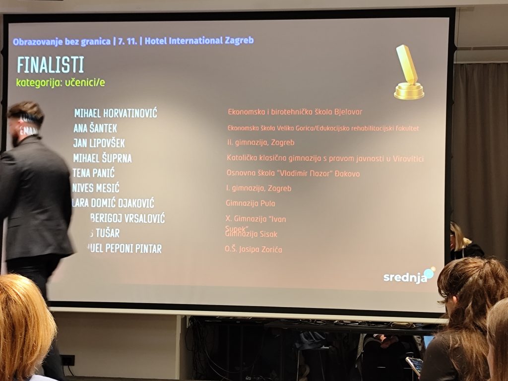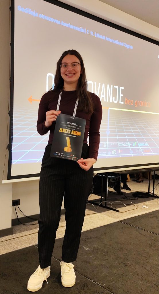 Portal srednja.hr po prvi put je na Godišnjoj konferenciji “Obrazovanje bez granica” održanom u petak 7. 11.2025. dodjelio nagradu “Zlatna kreda”. Nagrada “Zlatna kreda” dodjeljuje se učenicima/icama koji svojim radom i zalaganjem značajno doprinose obrazovnoj zajednici. Tom prilikom, voditeljica Volonterskog kluba Prve Nives Mesić , ušla je u top 10 finalista u kategoriji Najučenika/ice nagrade “Zlatna kreda”. Nives je uspješna i redovita maturantica 4.c razreda, uzornog vladanja i iznimno aktivna u izvannastavnim aktivnostima. Članica je školskog Čitateljskog kluba, sjajne rezultate postigla je na natjecanjima školskog tima Prve pomoći kojeg ove godine mentorira i najaktivnija je članica i voditeljica Volonterskog kluba, dobitnica priznanja Volonterski Oskar Volonterskog centra Zagreb za 2024. Čestitamo Nives!