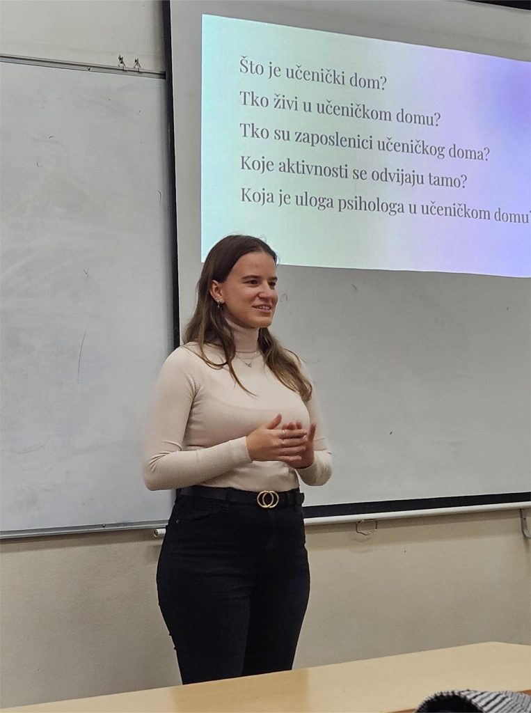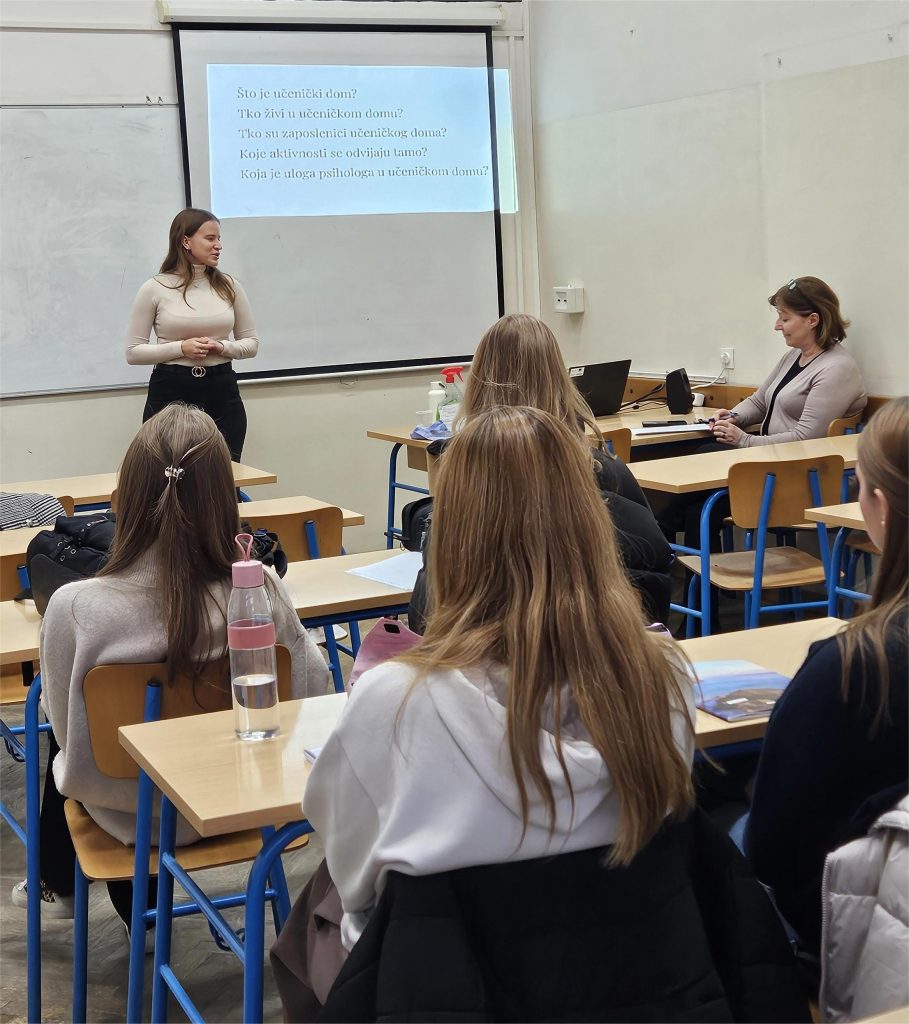 Dana 12. studenoga 2025. psihologinja Učeničkog doma Novi Zagreb Lara Belošević održala je učenicima drugih razreda izborne psihologije zanimljivo predavanje o svom poslu domskog psihologa. Saznali smo da u učeničke domove dolaze djeca iz cijele Hrvatske kako bi se školovala u Zagrebu.