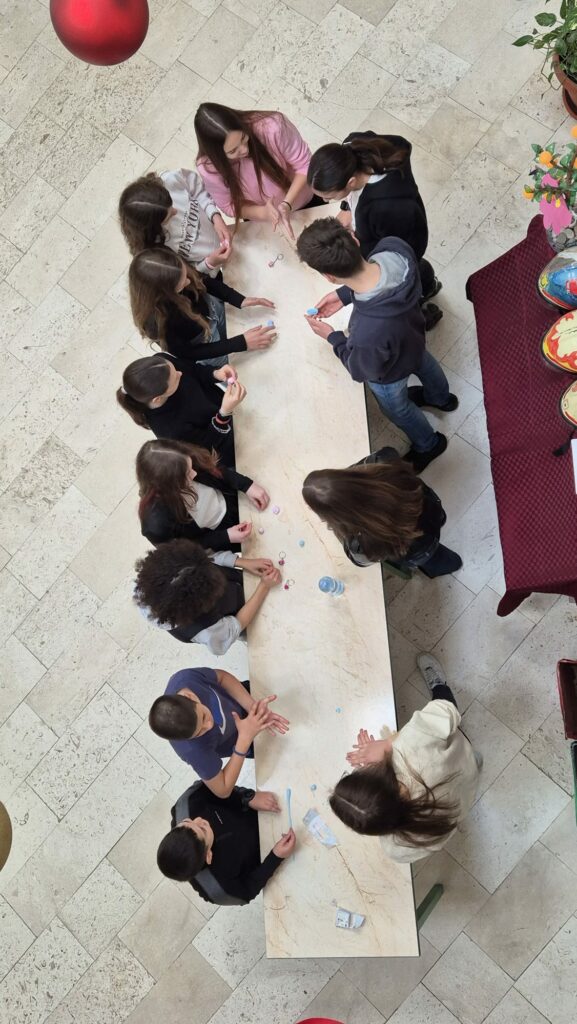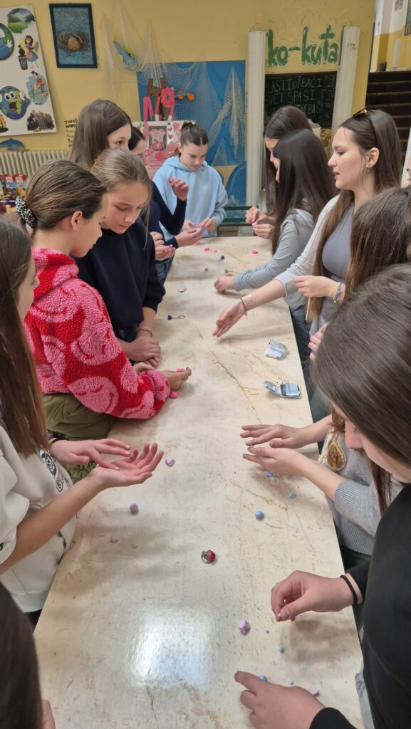 Učenike I. gimnazije (članovi učeničke zadruge Iz Prve ruke) i učenike OŠ Drago Milović iz Tivta (izvannastavna aktivnost Poduzetništvo) spojila je kreativnost i osigurala nezaboravne trenutke druženja i stvaranja. U dvosatnoj radionici koju je osmislila i održala voditeljica zadruge Gordana Sekulić-Štivčević nastali su ukrasni predmeti koji su prodavani na humanitarnom sajmu 19. ožujka 2026. u Tivtu.