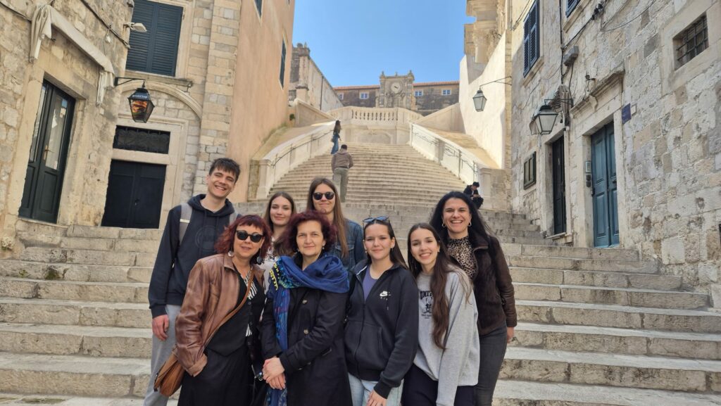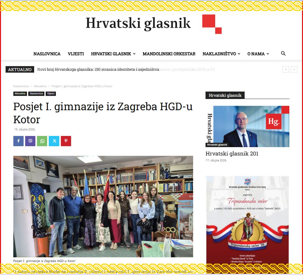 Učenici I. gimnazije (članovi UZ Iz Prve ruke) zajedno s ravnateljicom škole Dunjom Marušić Brezetić, profesoricama Gordanom Sekulić-Štivčević (voditeljicom projekta) i Ivom Deković (rodom iz Donje Lastve) boravili su Crnoj Gori od 10. do 14. ožujka 2026. u sklopu projekta Moderna tradicija 2. Partner u projektu je Hrvatsko nacionalno vijeće Crne Gore, a osoba zadužena od strane partnera je učiteljica Maja Širola Pean. U projektu sudjeluju učenici iz Tivta i Kotora koji slušaju nastavu hrvatskog jezika.
